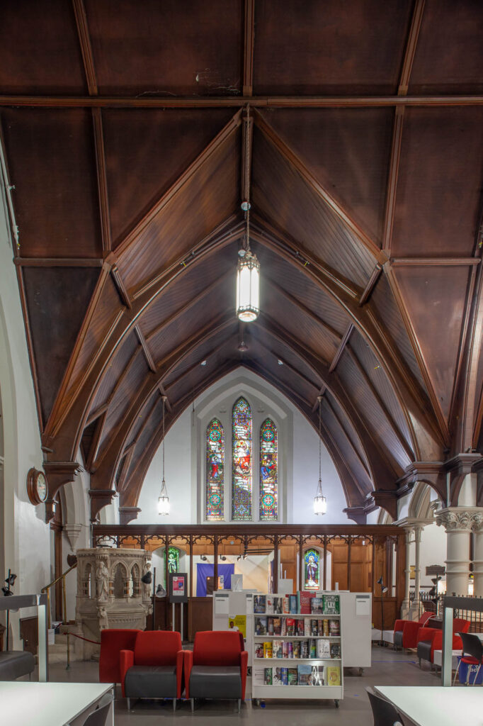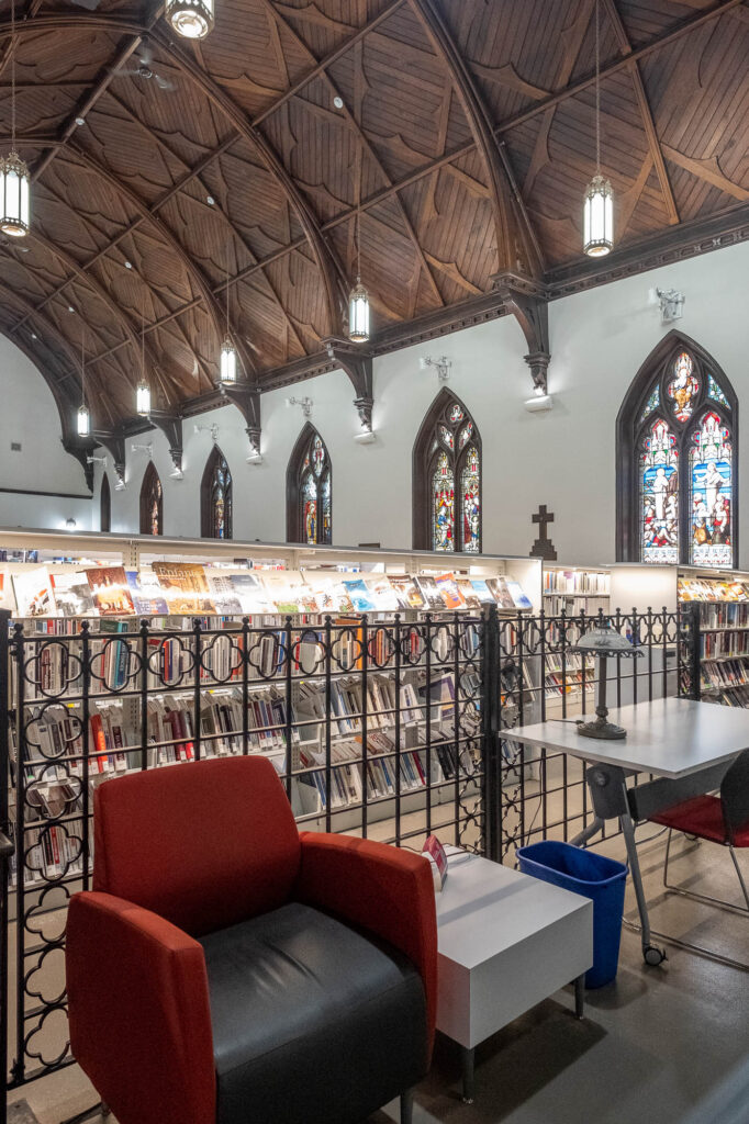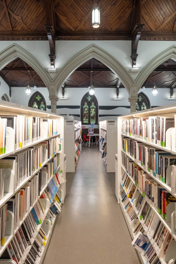 When the church fell into disuse, it was purchased by the city of Québec in 1979 and converted to a library branch by Gagnon, Letellier & Cyr in 1980.